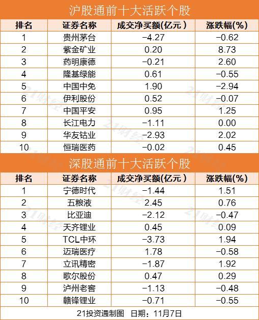 十大活跃个股方面,贵州茅台、TCL中环、华友钴业分别获净卖出4.27亿元、3.73亿元、2.93亿元。五粮液净买入额居首,金额为2.45亿元。值得留意的是,贵州茅台持续被减持,上周被抛售金额达26.97亿元。