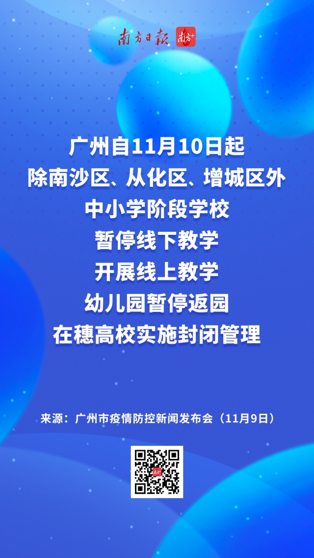 自11月10日(周四)起,全市除南沙区、从化区、增城区外,中小学阶段学校暂停线下教学,开展线上教学;高三年级有住宿条件的,在校实施全封闭管理;幼儿园暂停返园;校外培训机构暂停线下教学;托管、托育机构暂停服务,在穗高校实施封闭管理。