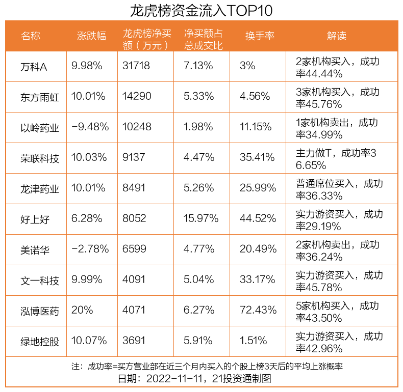 11月11日,上证指数上涨1.69%,深证成指上涨2.12%,创业板指上涨2.04%。盘后龙虎榜数据显示,共有45只个股因当日异动登上龙虎榜,资金净流入最多的是万科A(000002.SZ),达3.17亿元。