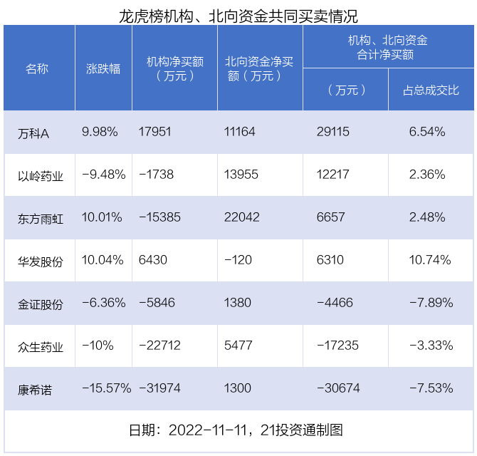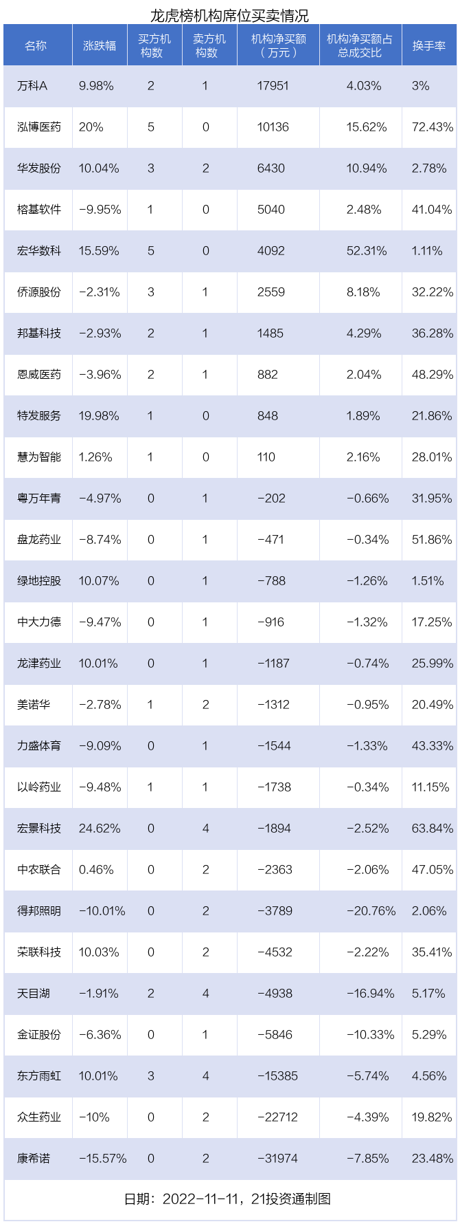 11月11日,27只个股龙虎榜出现了机构的身影,机构合计净卖出5.21亿元。具体来看,机构净买入10股,净卖出17股。其中,机构净买入金额最多的是万科A(000002.SZ)。机构净卖出的个股中,金额最多的是康希诺(688185.SH)。