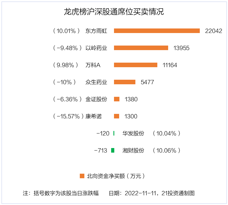 值得注意的是,机构和北向资金共同净买入了万科A;在东方雨虹,以岭药业,众生药业,金证股份,康希诺,华发股份上出现分歧,机构净卖出东方雨虹1.54亿元,北向资金净买入2.2亿元;机构净卖出以岭药业1738.4万元,北向资金净买入1.4亿元;机构净卖出众生药业2.27亿元,北向资金净买入5477.27万元;机构净卖出金证股份5845.55万元,北向资金净买入1380万元;机构净卖出康希诺3.2亿元,北向资金净买入1299.55万元;机构净买入华发股份6430.04万元,北向资金净卖出120.21万元。
