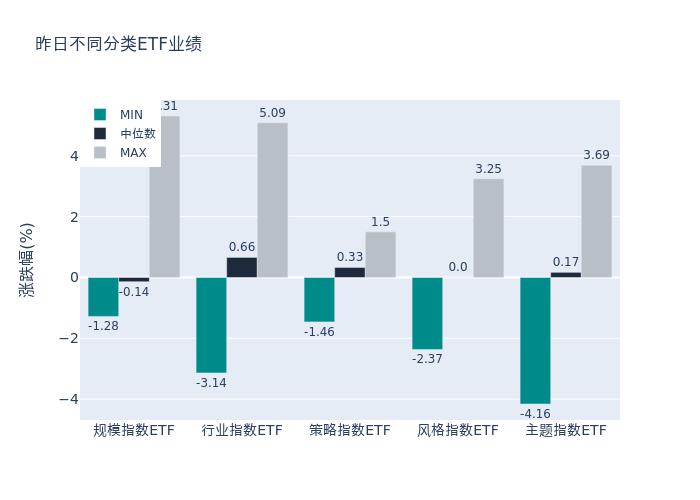 昨日股票型ETF收益率中位数为0.03%。其中按照不同分类,规模指数中中药ETF收益率最高,为5.31%;行业指数中香港医药收益率最高,为5.09%;策略指数中工银深红利ETF收益率最高,为1.5%;风格指数中嘉实医药健康100ETF收益率最高,为3.25%;主题指数中国泰中证生物医药ETF收益率最高,为3.69%。