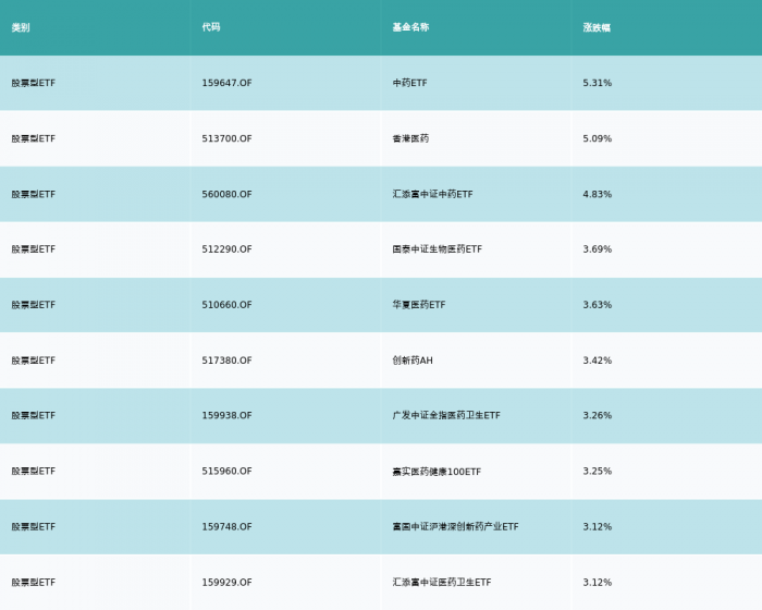 昨日股票型ETF涨幅最高的3支ETF及其收益率分别为:中药ETF(5.31%)、香港医药(5.09%)、汇添富中证中药ETF(4.83%)。涨幅前10详情见下表: