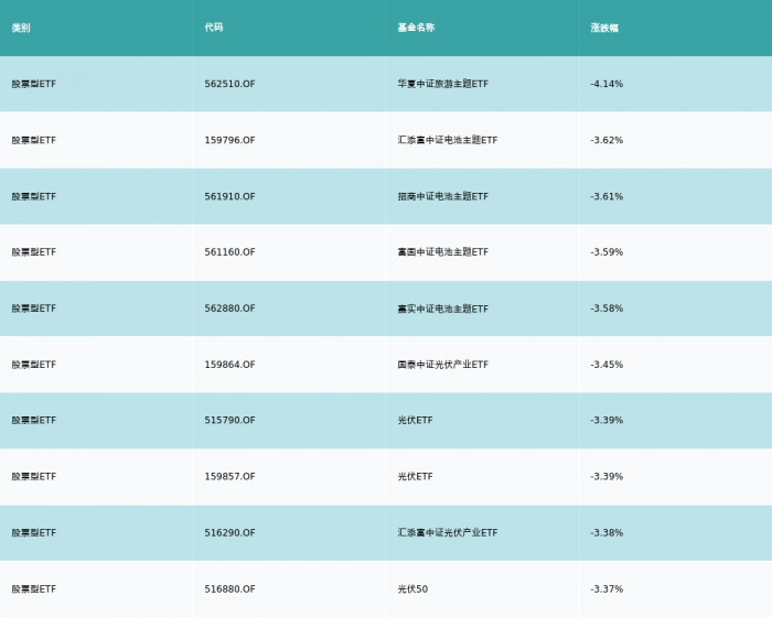 昨日股票型ETF跌幅最大的3支ETF及其收益率分别为:华夏中证旅游主题ETF(-4.14%)、汇添富中证电池主题ETF(-3.62%)、招商中证电池主题ETF(-3.61%)。跌幅前10详情见下表: