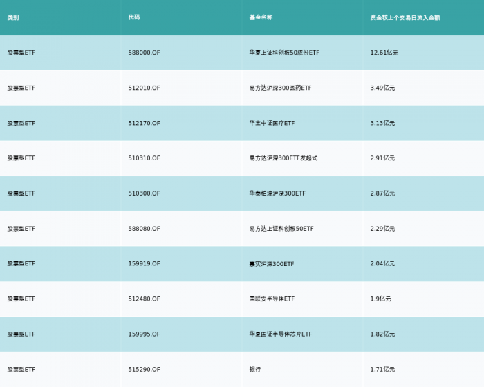昨日股票型ETF资金流入最多的3支ETF及其流入金额分别为:华夏上证科创板50成份ETF(流入12.61亿元)、易方达沪深300医药ETF(流入3.49亿元)、华宝中证医疗ETF(流入3.13亿元)。资金流入前10详情见下表: