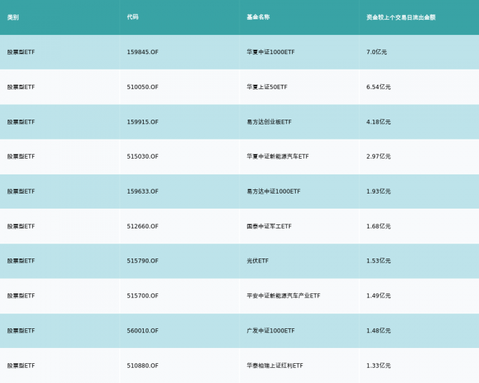 昨日股票型ETF资金流出最多的3支ETF及其流入金额分别为:华夏中证1000ETF(流出7.0亿元)、华夏上证50ETF(流出6.54亿元)、易方达创业板ETF(流出4.18亿元)。资金流出前10详情见下表: