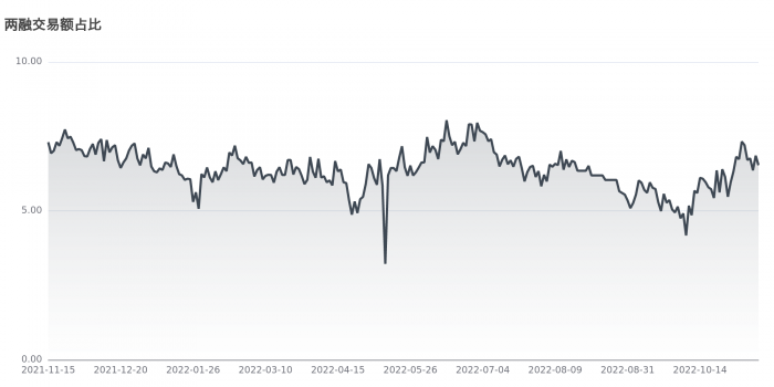 今日该指标值为6.53%,目前该指标处于近一年中立区间,说明投资者对A股持中立情绪。反映场内投资者借钱炒股的杠杆水平,该指标越高说明杠杆水平越高,即投资者认为当前市场较强,反之则说明投资者认为市场相对较弱,因而与上证指数存在较强的正相关性。