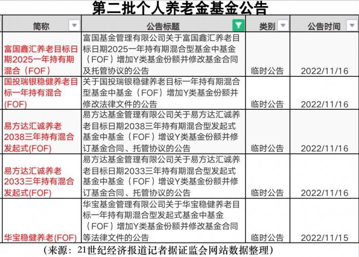 截至21世纪经济报道记者发稿时,证监会网站显示,11月15日晚上至 16日早上,第二批个人养老金基金新增了5只,公告增加Y类份额。