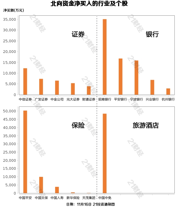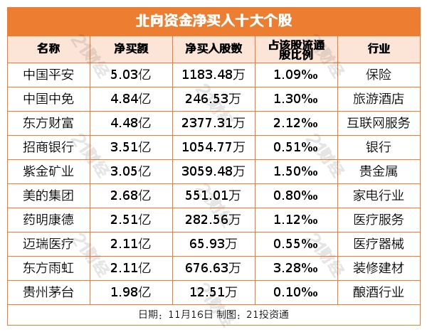 个股方面,北向资金净买入中国平安(601318.SH)、中国中免(601888.SH)、东方财富(300059.SZ)、招商银行(600036.SH)、紫金矿业(601899.SH)居前,其中,中国平安被净买入5.03亿元,中国中免被净买入4.84亿元,东方财富被净买入4.48亿元,招商银行被净买入3.51亿元,紫金矿业被净买入3.05亿元。