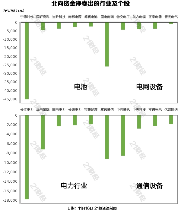 北向资金减持了64个行业,其中电池最多,净卖出金额达4.45亿元,其次是电网设备行业,净卖出3.82亿元。