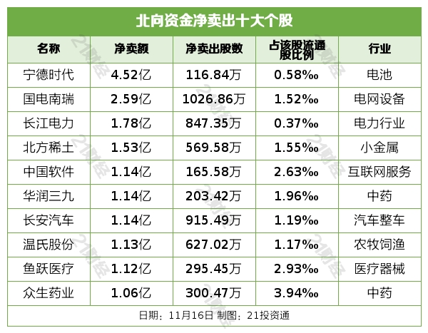 北向资金净卖出宁德时代(300750.SZ)、国电南瑞(600406.SH)、长江电力(600900.SH)、北方稀土(600111.SH)、中国软件(600536.SH)居前,其中,宁德时代被净卖出4.52亿元,国电南瑞被净卖出2.59亿元,长江电力被净卖出1.78亿元,北方稀土被净卖出1.53亿元,中国软件被净卖出1.14亿元。