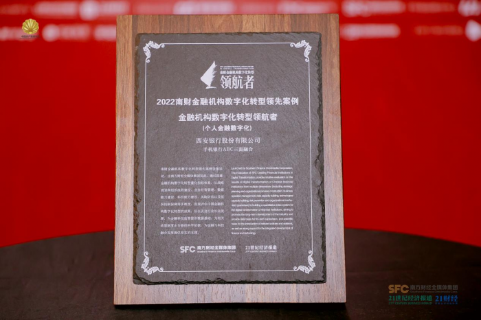 2022年11月15日,由21世纪经济报道主办并发起的2022 中国资产管理年会暨 2022 南财金融机构数字化转型领先案例发布仪式”在上海外滩举办。大会上,西安银行报送的“手机银行 ABC 三面融合”案例,经过重重筛选和综合评估,荣获“金融机构数字化转型领航者(个人金融服务数字化)”奖项。