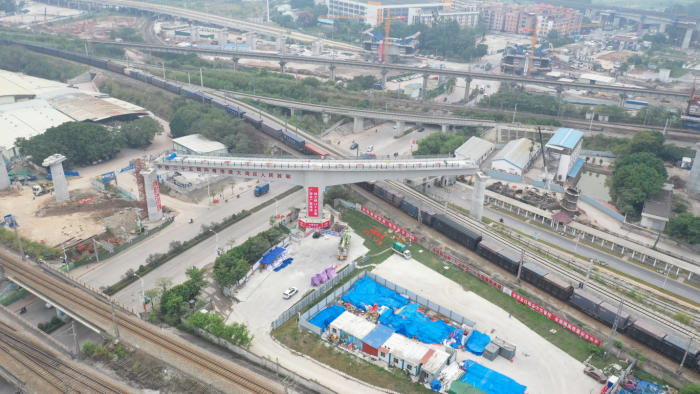据了解,广湛高铁广珠京广联络线全长3.627公里,建成后将为广湛高铁正线施工创造先决条件。该联络线共有9处特殊结构,上跨广珠铁路、京广铁路以及广清高速公路,并下穿武广高铁,其中临近营业线施工2.7公里,具有施工风险高、防护标准严、施工难度大的特点。