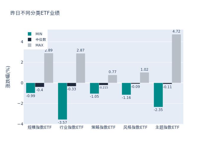 昨日股票型ETF收益率中位数为-0.24%。其中按照不同分类,规模指数中中药ETF收益率最高,为2.89%;行业指数中招商中证全指软件ETF收益率最高,为2.87%;策略指数中浦银安盛中证高股息ETF收益率最高,为0.77%;风格指数中嘉实新兴科技100ETF收益率最高,为1.02%;主题指数中国泰中证动漫游戏ETF收益率最高,为4.72%。