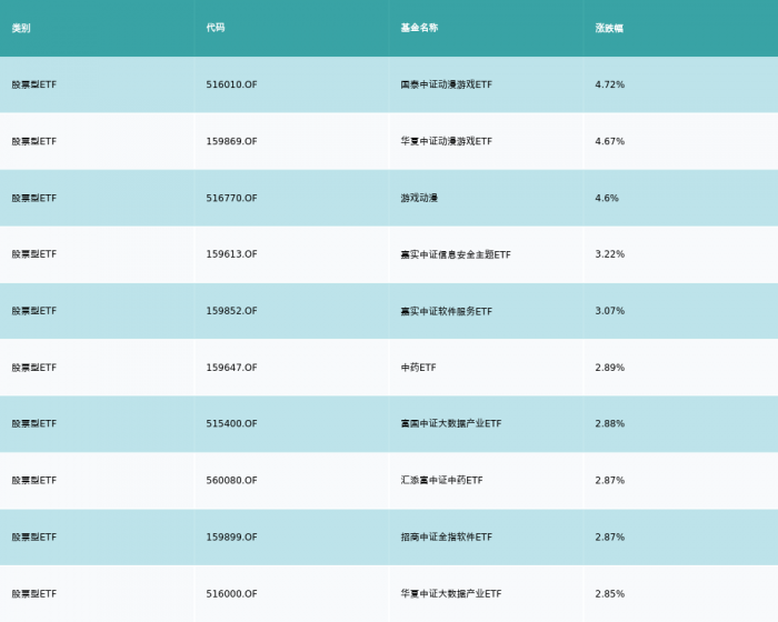 昨日股票型ETF涨幅最高的3支ETF及其收益率分别为:国泰中证动漫游戏ETF(4.72%)、华夏中证动漫游戏ETF(4.67%)、游戏动漫(4.6%)。涨幅前10详情见下表: