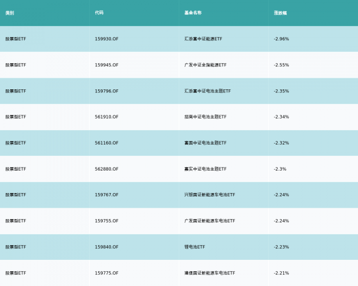 昨日股票型ETF跌幅最大的3支ETF及其收益率分别为:汇添富中证能源ETF(-2.96%)、广发中证全指能源ETF(-2.55%)、汇添富中证电池主题ETF(-2.35%)。跌幅前10详情见下表: