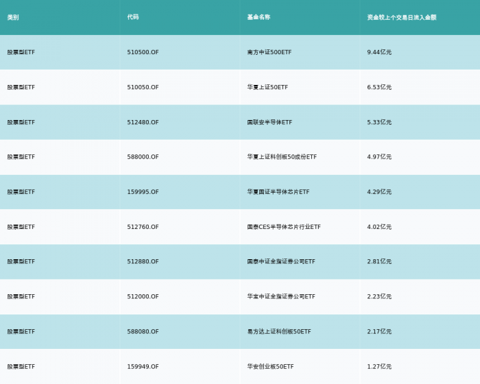 昨日股票型ETF资金流入最多的3支ETF及其流入金额分别为:南方中证500ETF(流入9.44亿元)、华夏上证50ETF(流入6.53亿元)、国联安半导体ETF(流入5.33亿元)。资金流入前10详情见下表: