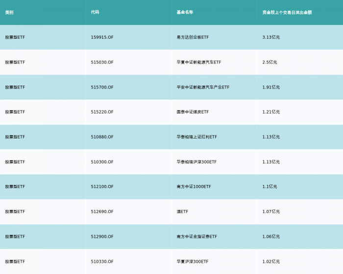 昨日股票型ETF资金流出最多的3支ETF及其流入金额分别为:易方达创业板ETF(流出3.13亿元)、华夏中证新能源汽车ETF(流出2.5亿元)、平安中证新能源汽车产业ETF(流出1.91亿元)。资金流出前10详情见下表: