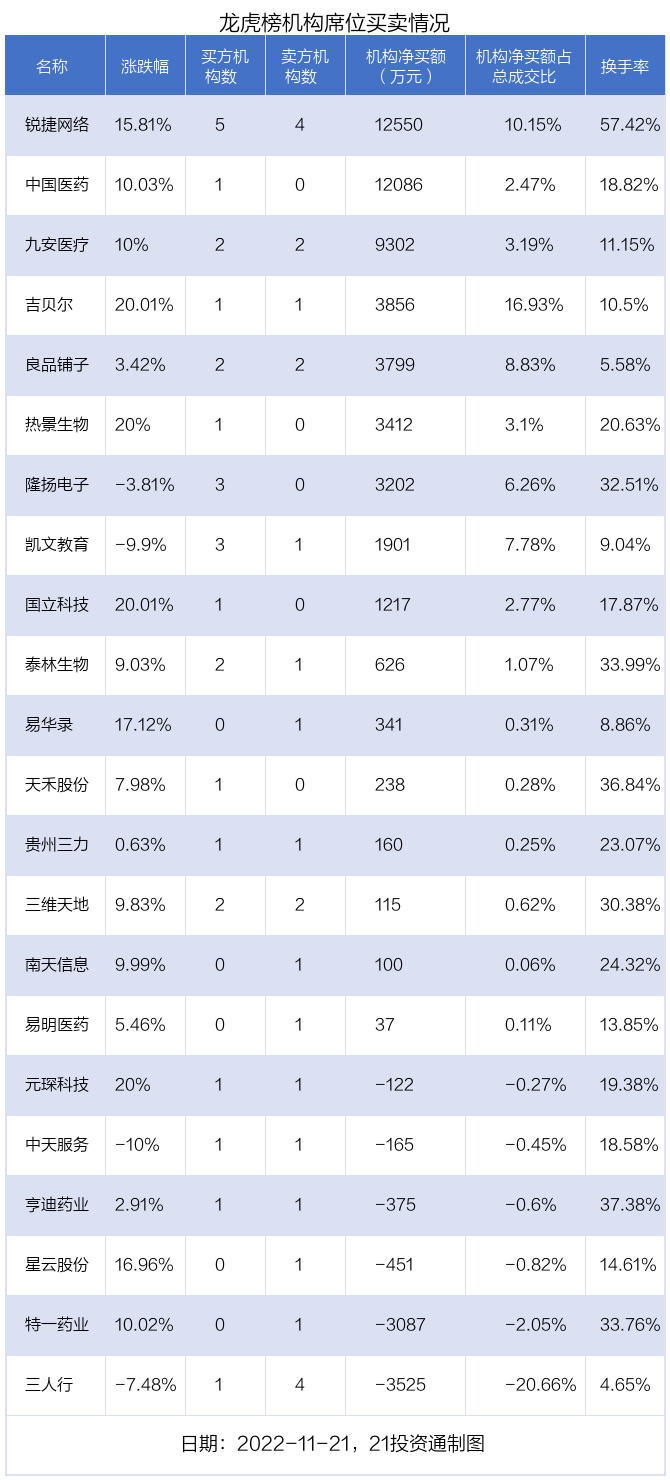 11月21日,22只个股龙虎榜出现了机构的身影,机构合计净买入4.52亿元。具体来看,机构净买入16股,净卖出6股。