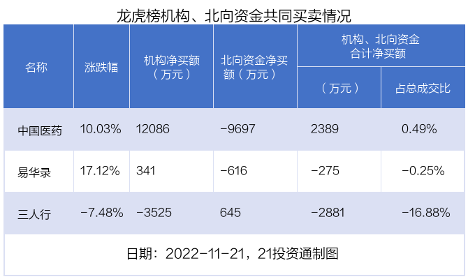 值得注意的是,机构和北向资金在三人行,易华录,中国医药上出现分歧,机构净卖出三人行3525.24万元,北向资金净买入644.59万元;机构净买入易华录340.69万元,北向资金净卖出615.55万元;机构净买入中国医药1.21亿元,北向资金净卖出9697.04万元。