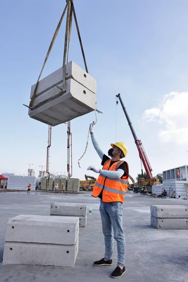 构件安装工 何飞 来自四川 我在广州南沙“健康驿站”安装构件,1小时组装60块。