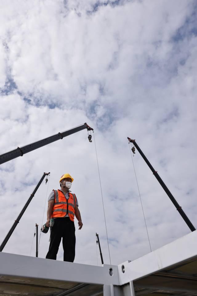 来自山东的吊车司机冯思魁,1小时吊装20块板材,8小时就能完成1个板房的安装。“自己的劳动和技术能在抗疫中出力,我很乐意。”