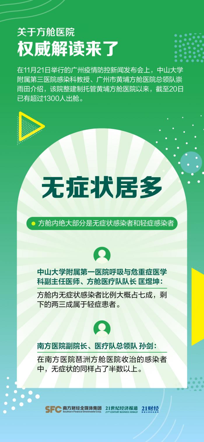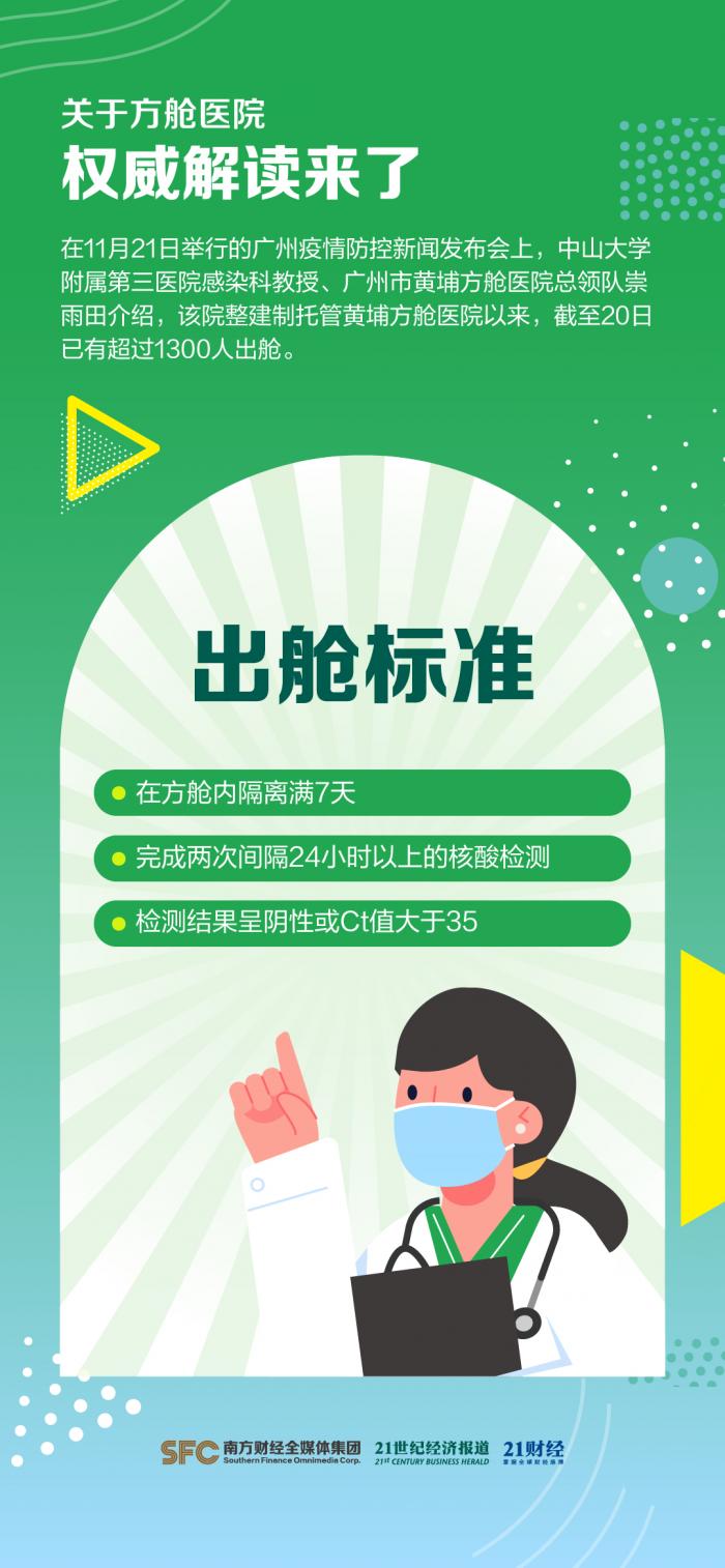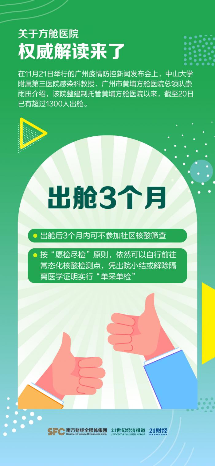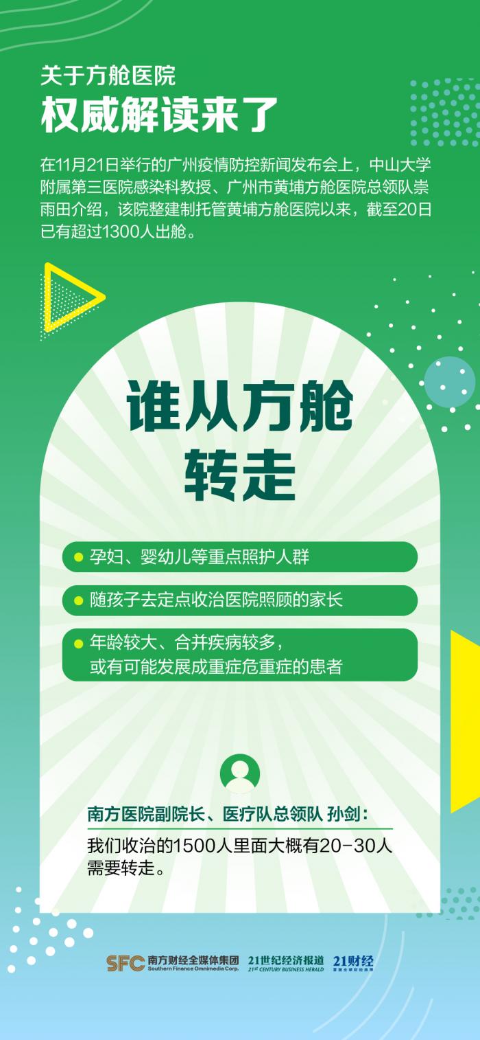在11月21日举行的广州疫情防控新闻发布会上,中山大学附属第三医院感染科教授、广州市黄埔方舱医院总领队崇雨田介绍,该院整建制托管黄埔方舱医院以来,截至20日已有超过1300人出舱。