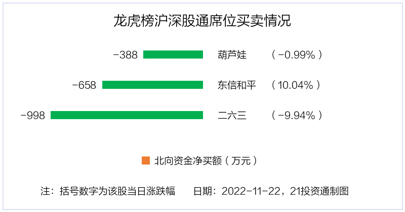 11月22日,北向资金参与龙虎榜中的个股共有3只,合计净卖出2043.34万元。其中沪股通净卖出1 股,净卖出387.79万元;深股通净卖出2 股,合计净卖出1655.55万元。