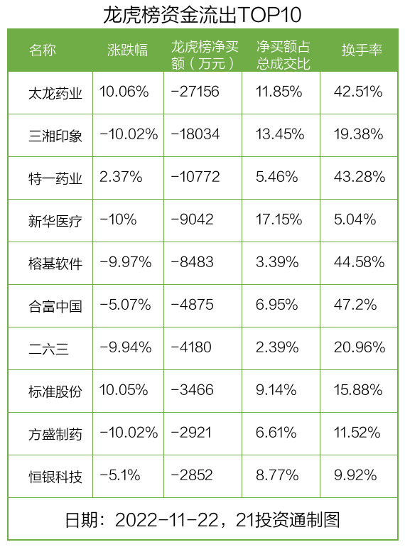 而龙虎榜中资金净流出最多的是太龙药业(600222.SH),被净卖出为2.7亿元,占总成交金额的11.85%。太龙药业收盘上涨10.06%,换手率为42.51%。