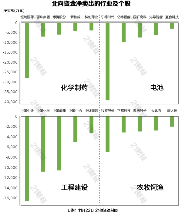 北向资金减持了67个行业,其中化学制药最多,净卖出金额达7.78亿元,其次是电池行业,净卖出5.57亿元。