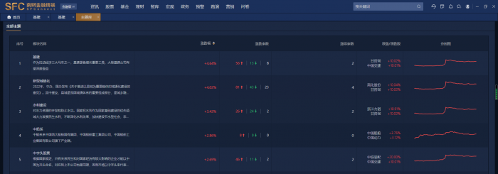 值得注意的是,位列主题库涨幅第五的中字头股票主题与基建主题保持了同步的上涨趋势。作为中字头股票中的重要成分,建筑央企股纷纷高涨,中国交建涨超10.00%,中钢国际,中国化学,中国铁建,中国建筑等多股跟涨。