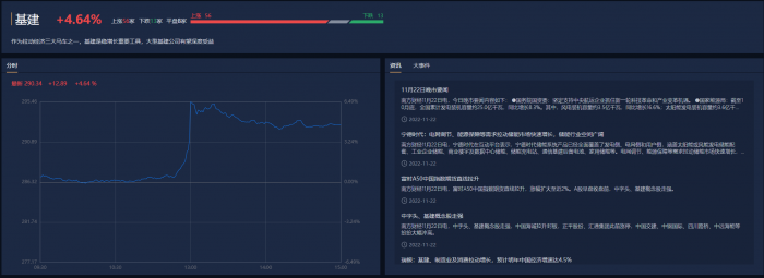 11月22日基建股午后大幅上涨,南财金融终端主题库显示,基建主题在经历了早盘的平静后,午后异动拉升,一跃成为昨日主题库涨幅第一的主题。截至22日A股收盘,基建主题涨幅达到4.64%,排名2到3位的主题也是与基建相关的新型城镇化主题与水利建设主题。