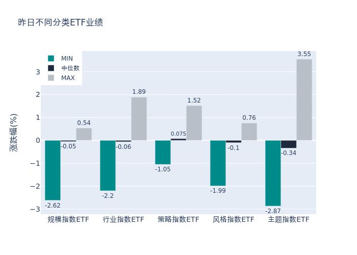 昨日股票型ETF收益率中位数为-0.1%。其中按照不同分类,规模指数中易方达上证中盘ETF收益率最高,为0.54%;行业指数中南方中证新能源ETF收益率最高,为1.89%;策略指数中国泰富时中国国企开放共赢ETF收益率最高,为1.52%;风格指数中华夏创成长ETF收益率最高,为0.76%;主题指数中国泰中证光伏产业ETF收益率最高,为3.55%。