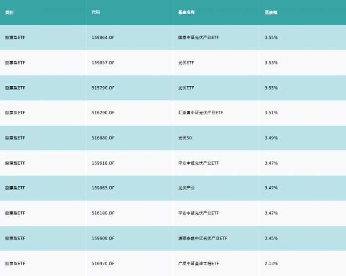 昨日股票型ETF涨幅最高的3支ETF及其收益率分别为:国泰中证光伏产业ETF(3.55%)、光伏ETF(3.53%)、光伏ETF(3.53%)。涨幅前10详情见下表: