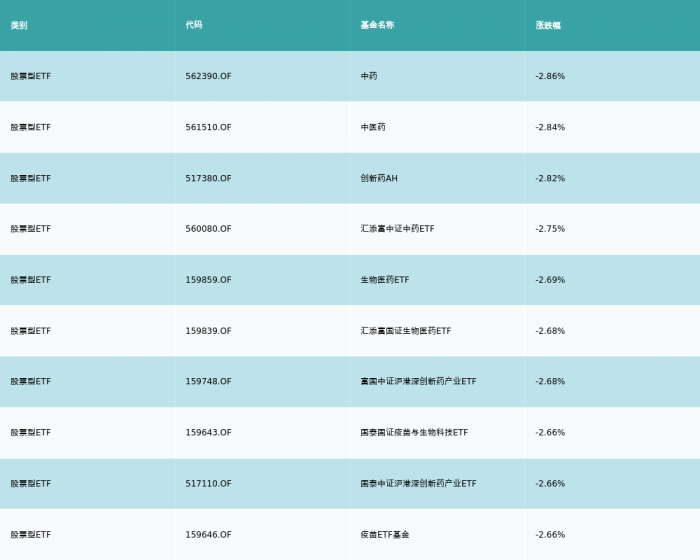 昨日股票型ETF跌幅最大的3支ETF及其收益率分别为:中药(-2.86%)、中医药(-2.84%)、创新药AH(-2.82%)。跌幅前10详情见下表: