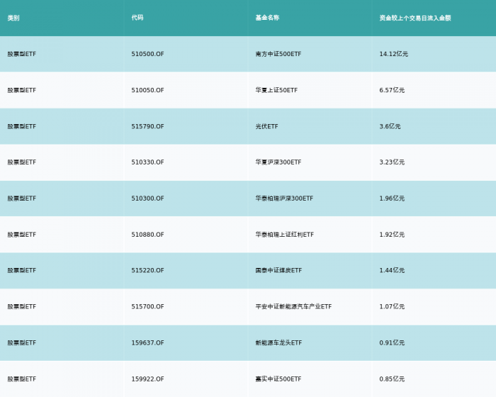 昨日股票型ETF资金流入最多的3支ETF及其流入金额分别为:南方中证500ETF(流入14.12亿元)、华夏上证50ETF(流入6.57亿元)、光伏ETF(流入3.6亿元)。资金流入前10详情见下表: