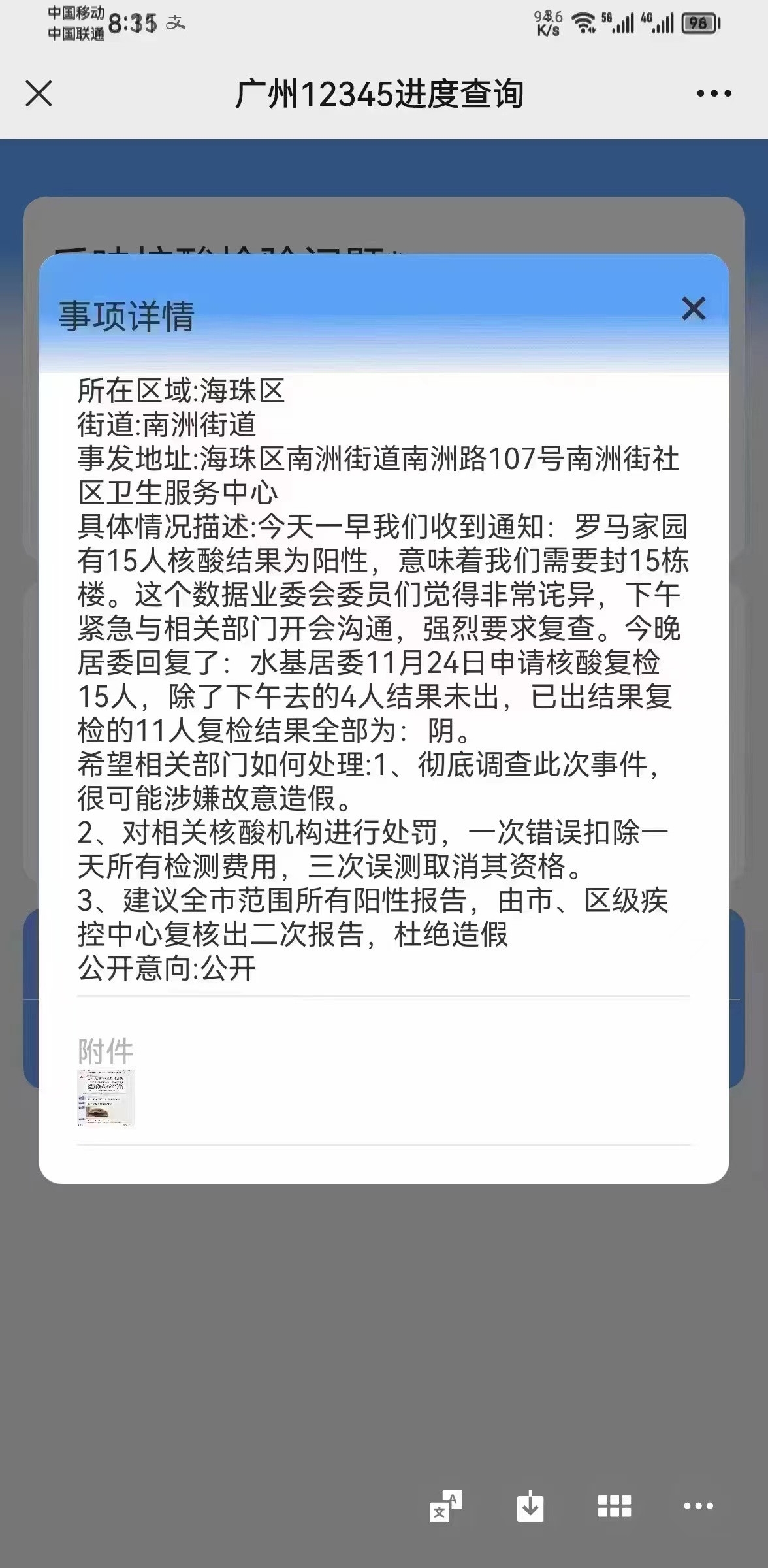 近日,一张“广州12345进度查询”截图显示,某小区有居民就核酸检测结果事宜向12345投诉。