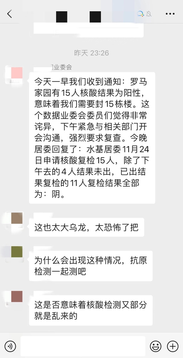 据悉,11月24日早上,该小区业委会收到通知:小区内有15人核酸结果为阳性。对此数据,业委会感到非常诧异。后在居民强烈要求下,该小区所在的居委立即申请对核酸结果显示为阳性的15人进行复检。当天除4人结果未出外,11人复检结果全部为阴性。于是,小区居民就此事提出诉求,希望相关部门能彻底调查此次事件,并对相关核酸机构进行处罚。