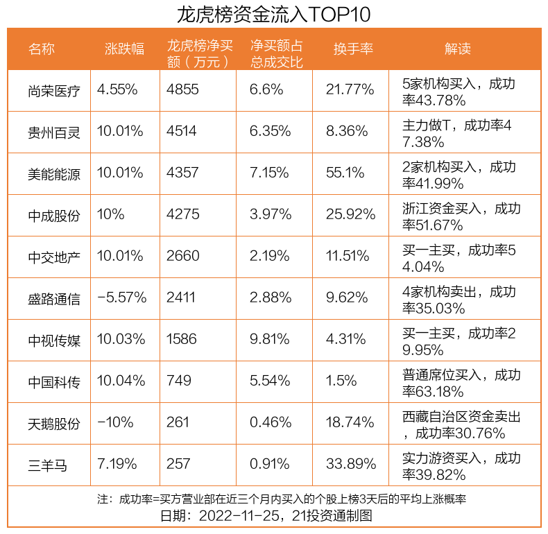 11月25日,上证指数上涨0.4%,深证成指下跌0.48%,创业板指下跌1.12%。盘后龙虎榜数据显示,共有35只个股因当日异动登上龙虎榜,资金净流入最多的是尚荣医疗(002551.SZ),达0.49亿元。