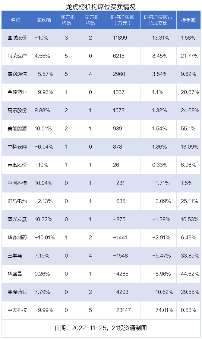 11月25日,16只个股龙虎榜出现了机构的身影,机构合计净卖出1.12亿元。具体来看,机构净买入8股,净卖出8股。