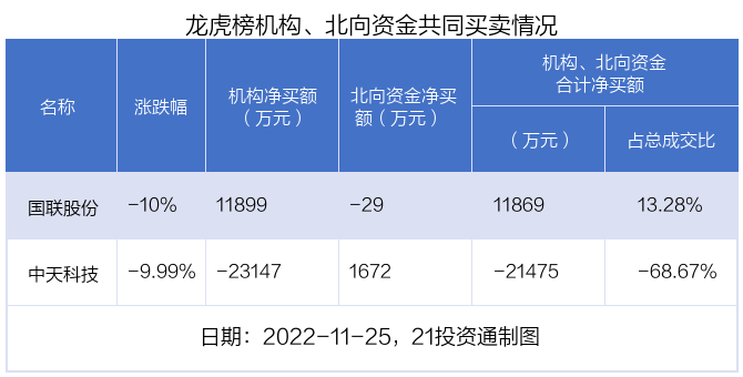 值得注意的是,机构和北向资金在中天科技,国联股份上出现分歧,机构净卖出中天科技2.31亿元,北向资金净买入1672.01万元;机构净买入国联股份1.19亿元,北向资金净卖出29.2万元。