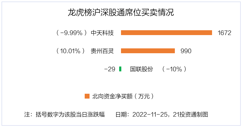 11月25日,北向资金参与龙虎榜中的个股共有3只,合计净买入2632.67万元。其中沪股通净买入1 股,净卖出1 股,合计净买入1642.81万元;深股通净买入1 股,净买入989.86万元。