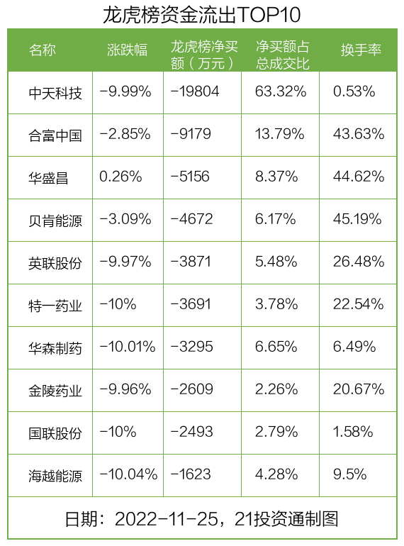 而龙虎榜中资金净流出最多的是中天科技(600522.SH),被净卖出为1.98亿元,占总成交金额的63.32%。中天科技收盘下跌9.99%,换手率为0.53%。