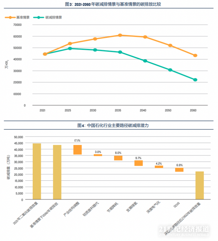 根据当前石化行业发展的趋势、已经出台的节能降碳规划和政策,以及行业正在采取的降碳行动,《石化报告》设定了基准情景和碳减排情景两种模式。在基准情景下,石化行业预计在2035年实现碳达峰,峰值碳排放量约为6亿吨。