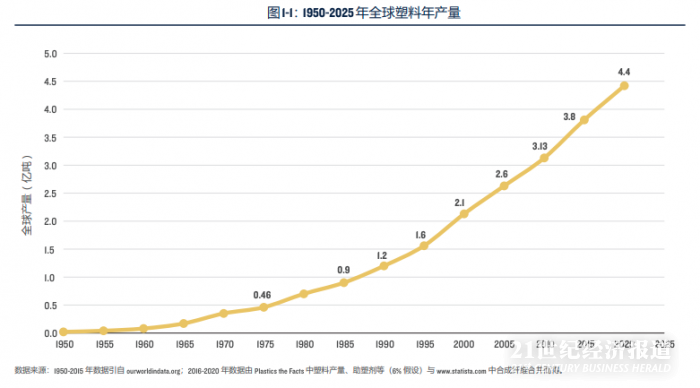 塑料作为一种新材料,自1950年代逐渐进入规模化生产时代。由于轻质、耐用、好用的属性,塑料迅速成为石化产品最大的需求方。近年来,全球塑料生产与消费已经进入高速发展期,2016年-2020年,全球共生产了22亿吨塑料。加上1950年-2015年的累计产量,全球塑料产量已经累计达到105亿吨。