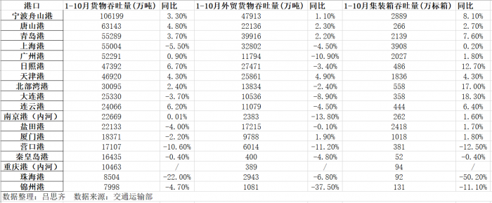 南方财经全媒体记者统计了今年1—10月我国主要港口的货物吞吐量,发现大部分港口货物吞吐量整体呈现同比增长态势,但外贸货物吞吐量多为同比下降。