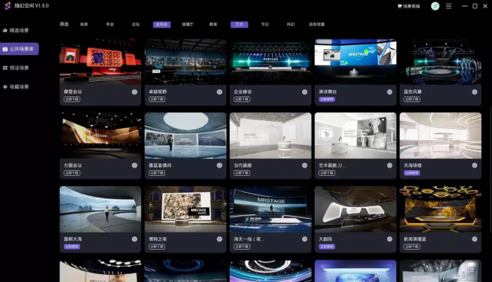 “舞台不用搭建,仅需原始模板,再将会议所需的素材往里面填充就可以了。”该产品还有一个“异地同台”功能,主持人和演讲嘉宾可以在自己的办公室或是家中远程进入虚拟场景。