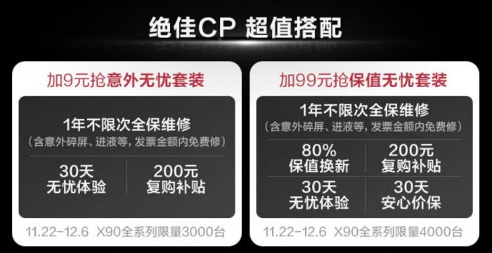 为更好满足年轻群体的需求,近日,京东携手vivo针对新机vivo X90系列推出限量超值服务套餐,包括9元意外无忧套装(包括1年不限次全保维修、30天无忧体验、200元复购补贴)和99元保值无忧套装(包括1年不限次全保维修、80%保值换新、30天无忧体验、30天安心价保、200元复购补贴),让消费者购机更有保障,省心又省钱。
