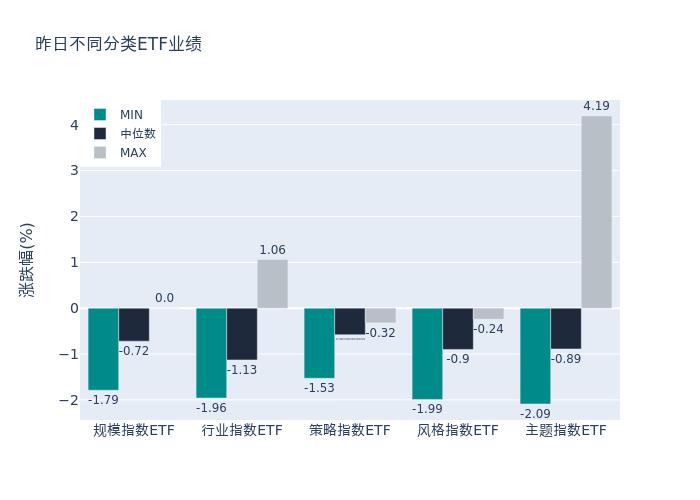 昨日股票型ETF收益率中位数为-0.87%。其中按照不同分类,规模指数中招商中证1000增强策略ETF收益率最高,为0.0%;行业指数中广发中证全指电力ETF收益率最高,为1.06%;策略指数中华安中证500低波ETF收益率最高,为-0.32%;风格指数中华夏中证智选500价值稳健策略ETF收益率最高,为-0.24%;主题指数中富国中证旅游主题ETF收益率最高,为4.19%。