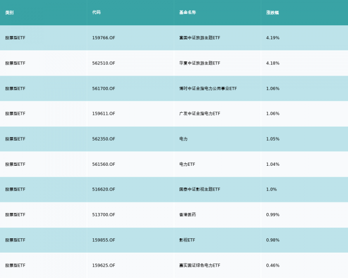 昨日股票型ETF涨幅最高的3支ETF及其收益率分别为:富国中证旅游主题ETF(4.19%)、华夏中证旅游主题ETF(4.18%)、博时中证全指电力公用事业ETF(1.06%)。涨幅前10详情见下表: